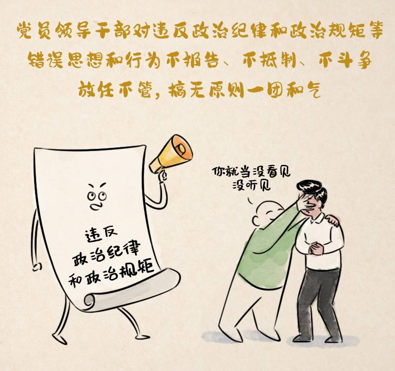 第七十五条 党员领导干部对违反政治纪律和政治规矩等错误思想和行为不报告、不抵制、不斗争,放任不管,搞无原则一团和气,造成不良影响的,给予警告或者严重警告处分;情节严重的,给予撤销党内职务或者留党察看处分。