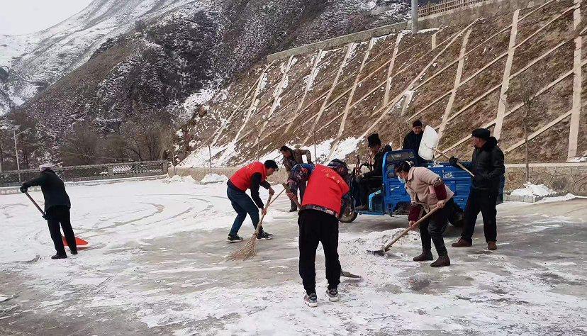 2月7日,农历大年初七,伴随着凛冽的寒风,卓尼县柳林镇东石沟村气温骤降,雪花纷纷扬扬地飘落,厚厚地积雪给人民群众的生活带来诸多不便。必一体育驻村帮扶工作队在镇党委的统一部署下,不畏严寒,迅速投入到环境卫生整治、融化结冰路面和清扫积雪活动中。