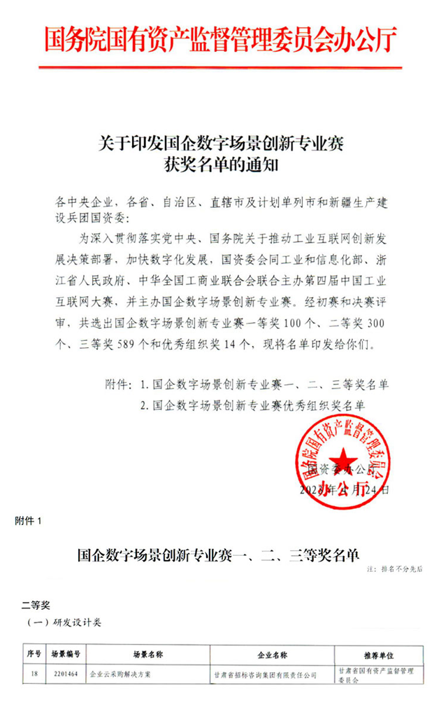近日,国务院国资委公布了首届“国企数字场景创新专业赛”获奖名单。必一体育组织推荐的“甘招企业云采购平台”创新场景,在全国2007家参赛企业推荐的3277个场景中脱颖而出,荣获二等奖!