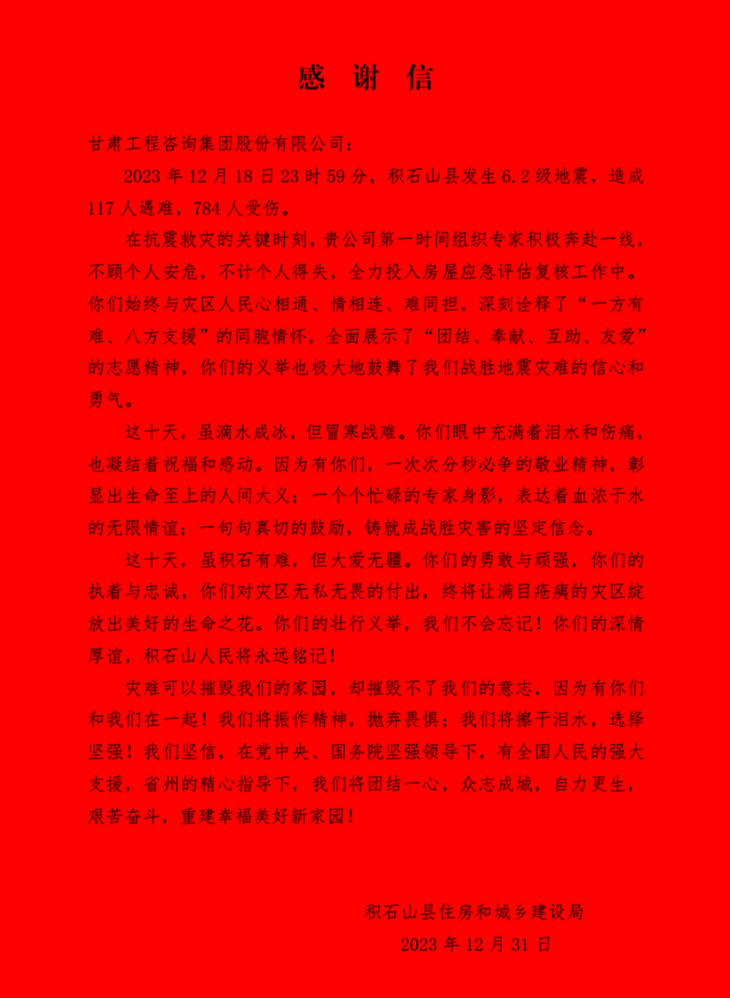 1月3日上午,积石山县住房和城乡建设局向必一体育赠送“为百姓不惧艰险,战险情奋勇争先”锦旗,并发来《感谢信》,对在抗震救灾关键时刻奔赴灾区开展房屋应急评估工作的专家表达感谢和敬意。