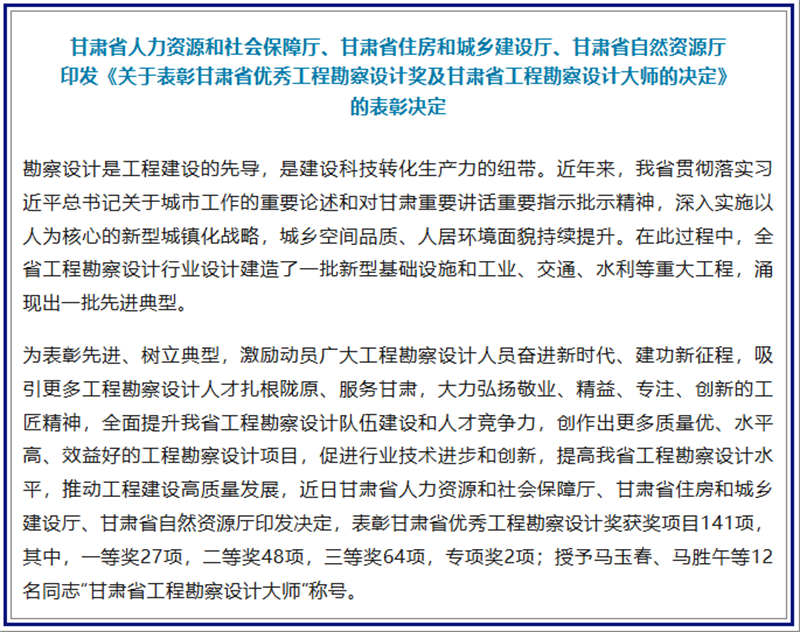5月中旬,省人力资源和社会保障厅、省住房和城乡建设厅、省自然资源厅印发《关于表彰甘肃省优秀工程勘察设计奖及甘肃省工程勘察设计大师的决定》,必一体育38项勘察设计项目(作品)获“甘肃省优秀工程勘察设计奖”,其中一等奖9项,二等奖16项,三等奖13项;毛明强、李中辉、张岭峻获“甘肃省工程勘察设计大师”称号。