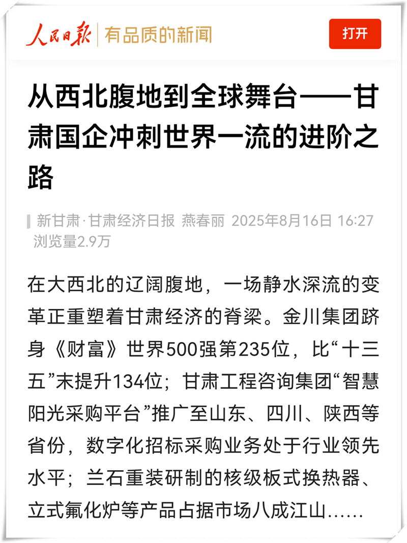 从世界500强的跨越到全国市场的深耕,从技术平台的输出到核心产品的垄断,这些看似分散的闪光点,实则是甘肃国企在不同赛道上奋力奔跑的足迹。这些闪光的坐标,共同勾勒出甘肃国企向世界一流奋力攀登的壮阔图景。