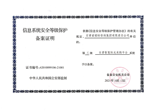 近日,由招标咨询集团负责开发建设的甘肃智慧阳光采购平台系统,以及甘肃智慧阳光采购平台采购网系统、大数据监管系统、招标系统、保证金系统、专家管理系统通过国家三级等保认证,系统管理安全能力获得业界最高标准。