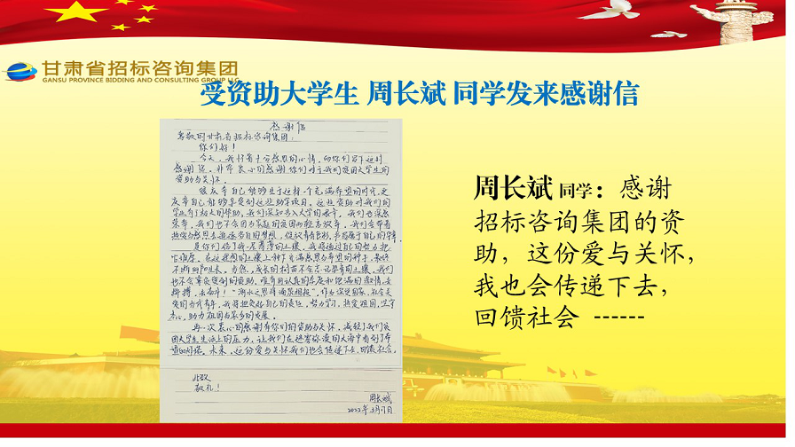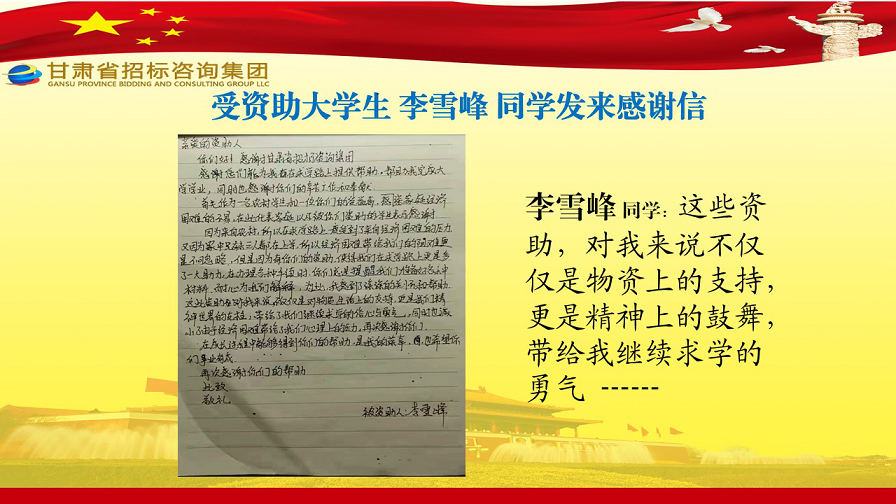 近日,张家川县张棉驿乡张棉村贫困大学生代表刘国熙、周长斌、李雪峰等向甘肃省招标咨询集团有限责任公司发来感谢信,就招标咨询集团给予学费资助一事表达他们的感激之情。