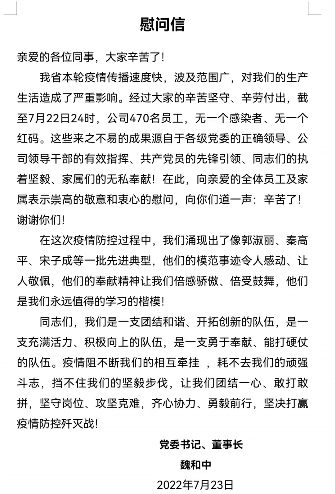 近日,甘肃省建设监理有限责任公司党委书记、董事长魏和中向全体职工发出慰问信,对在疫情期间值守项目一线和抗战疫情一线的党员干部职工致以最诚挚的关心和感谢。同时,号召全体干部职工向疫情防控期间涌现出的一线先进典型个人和共产党员先锋者学习,团结一心、敢打敢拼,坚守岗位、攻坚克难,齐心协力、勇毅前行,坚决打赢疫情防控歼灭战。