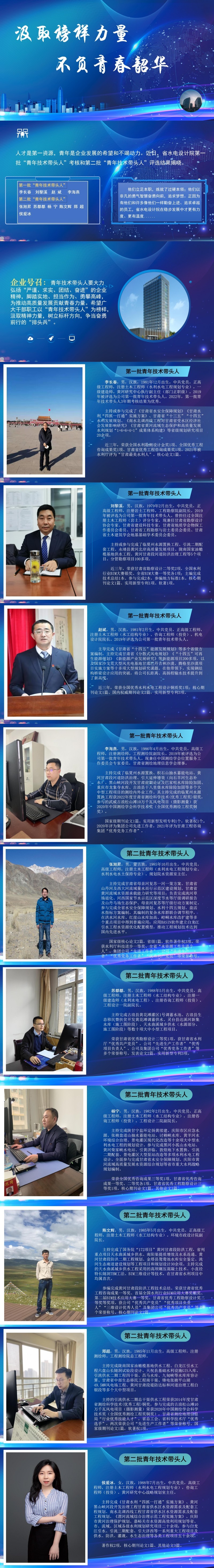 被评为青年技术带头人的10名青年员工,他们立足本职,一步一个脚印,苦练技能,实干在前,以超群的专业能力展现青年的担当作为;他们以非凡的勇气智慧奋勇向前,追逐梦想,彰显新时代技能人才的“硬核”力量;他们是青年群体的排头兵,是专业领域的攀登者,是“传帮带”的助力人。正因为有他们和许多像他们一样勤奋上进、追求卓越的员工,省水电设计院在稳步发展中才更有力度、更有温度......