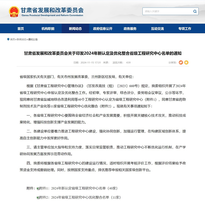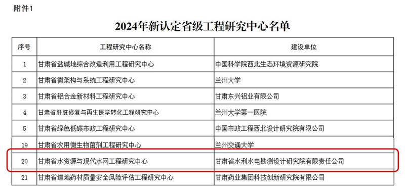 近日,省发展和改革委员会公布《2024年新认定及优化整合省级工程研究中心名单》,省水电设计院申报的“甘肃省水资源与现代水网”成功获批立项“省级工程研究中心”,标志着公司在水利工程科研平台建设方面取得了重大突破。